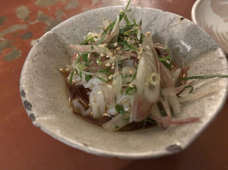 かなり細く切れれた薬味沢山のイカソーメン。酒のあてにピッタリの一品。