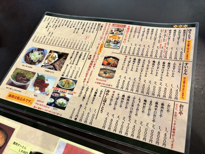 ほうとう以外にも、すいとん、海老天丼、ざるそば、おじやなど幅広いメニューが揃っていました。